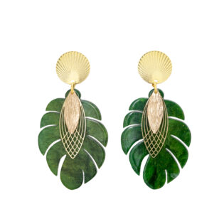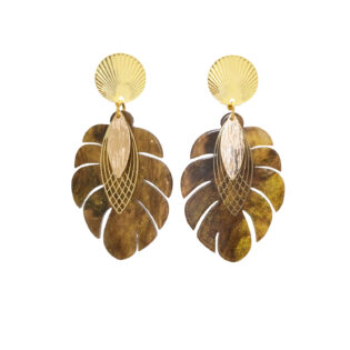 Clips d’oreilles composés d’un support avec effet plissé et d’une feuille de bananier en acétate de cellulose recouverte d’une estampe et d’une navette poncée en laiton doré à l’or fin.