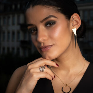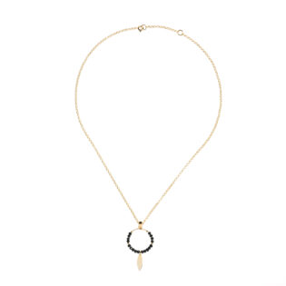 Sur une chaîne maille jaseron, le pendentif Colibri dévoile un anneau de spinelles noirs facettés intercalés de petites perles rondes en laiton doré à l’or, retenant une délicate navette brillante.